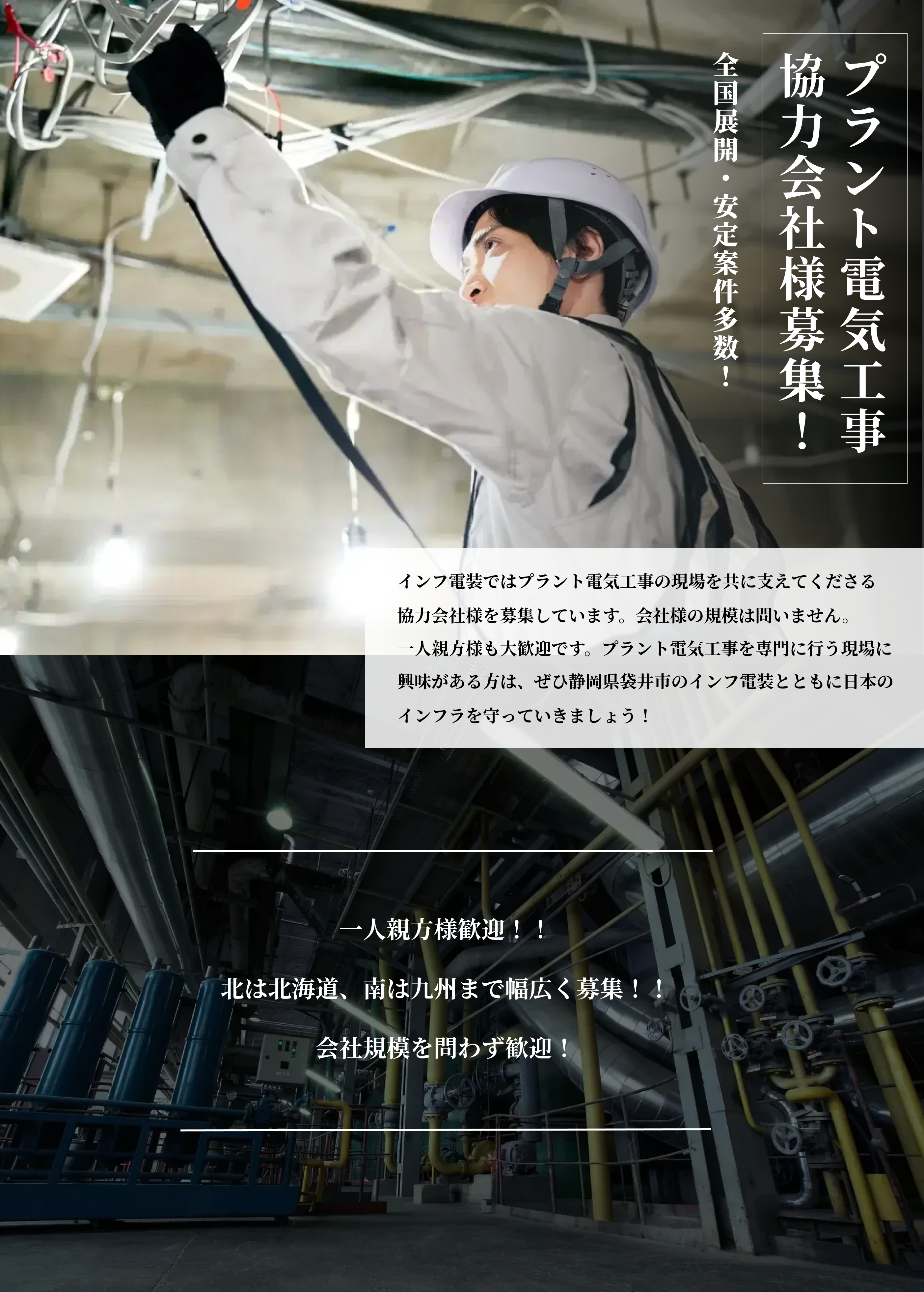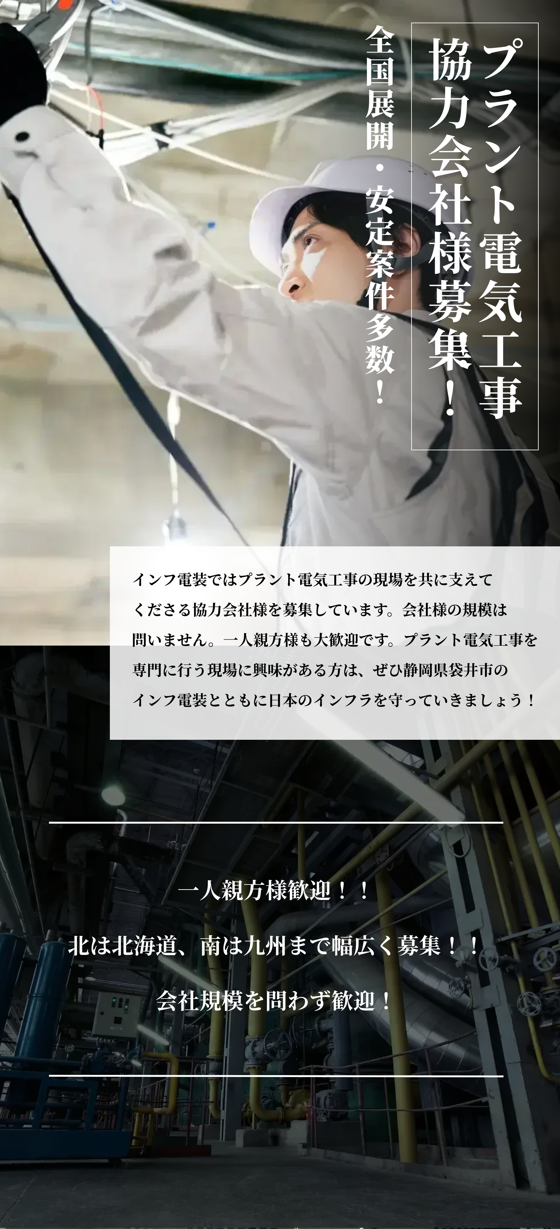 | 募集業種 | 石油プラント・化学プラント・ガス製造プラント・発電プラント・鋼鉄プラント・半導体工場などの電気工事・計装工事 |